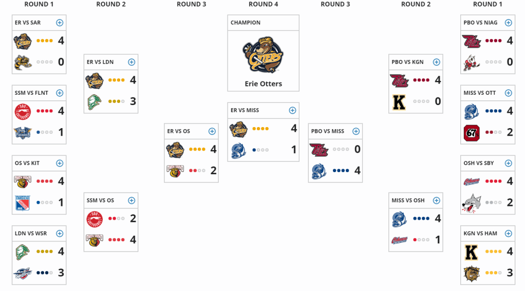 With a new coach and a developing young core, I expected more from the 67’s in this season. The 67’s made a trade for 3 members of the Steelheads with the most notable name being Merrick Rippon. Development was still key for this young group, but to say I was surprised by an 8th place finish would be an understatement. There was a hope for a better season, but being so bad landed them Cam Tolnai who still hasn’t reached his full potential. This team still made the playoffs, but everyone knew it would be short lived. Here’s the playoff bracket.