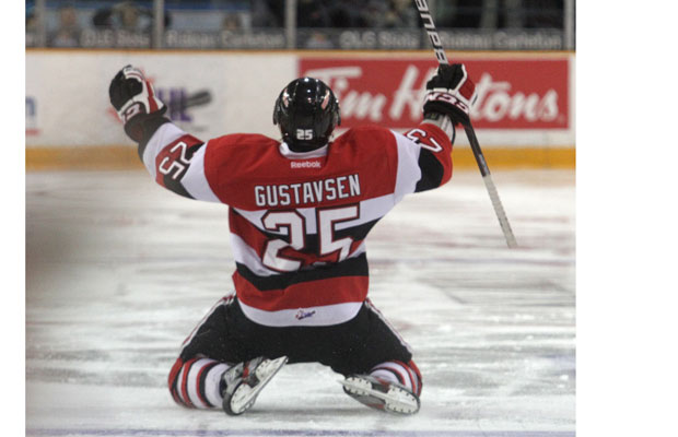 The second round wouldn’t be any easier for the 67’s, and after winning game 1, they would drop 3 straight games to go down 3-1. They could have quit, but they didn’t. The 67’s would take games 5 and 6 by one goal and head back to Ottawa for game 7. With the game going into overtime tied at 3, both teams knew what was on the line. Towards the end of the first overtime period, Brett Gustavsen scored the game winning goal to send the 67’s to the Eastern Conference Finals against the Niagara IceDogs, and this photo was taken.