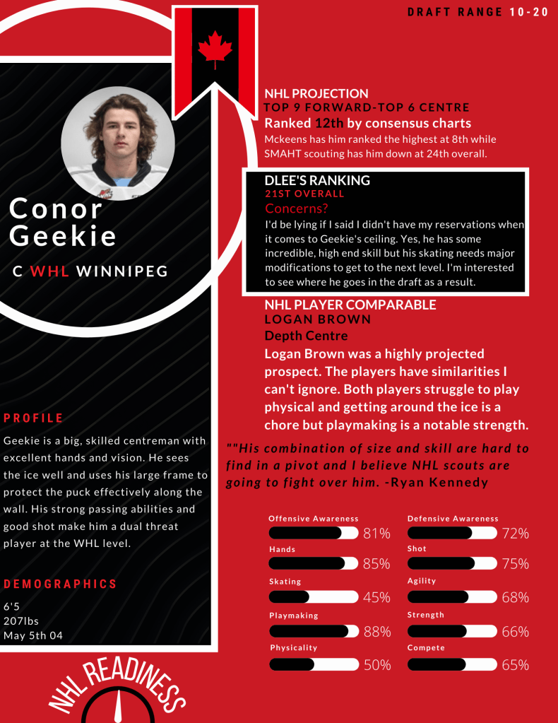 I could definitely see Ottawa selecting him though, size always matters for Ottawa. Even if he doesn’t necessarily play physical, he uses his size effectively in other ways, such as creating space for himself and protecting pucks. although listed as a centre, it’s not unrealistic to suggest Geekie could become a winger at the NHL level.